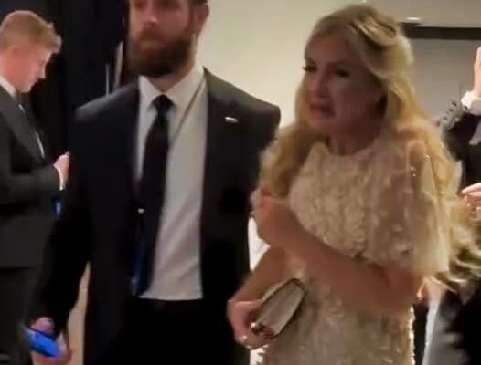 The emotional footage, posted by @rawsalerts, shows the blonde conservative leader in a sparkling gown appearing shaken, her face streaked with tears as she clutches a clutch purse and is guided away from the chaotic scene.